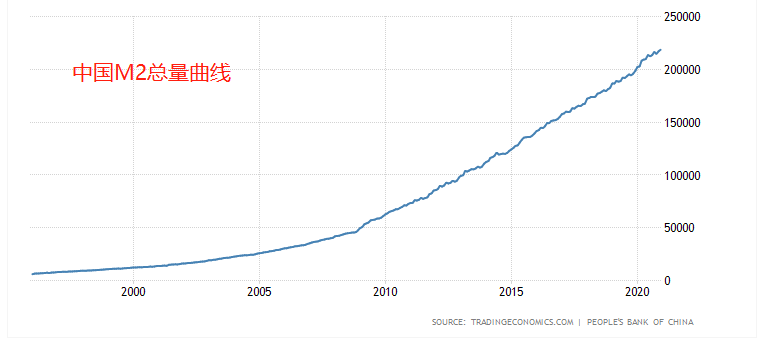 可以看出,自1995年以来,中国的M2总量都保持了高速上涨的态势。上图曲线解释了为什么基准率在不断下降,但银行吸收存款在不断的提升的形成原因。最新的M2总额为218.7万亿人民币,上面我们曾提到,工商银行吸收存款总额为22.98万亿,这也意味着工商银行的居民存款占据市场中所有资金的10%以上,所以工商银行才被人们称作是“宇宙第一大行”。