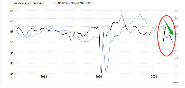 中国和美国是全球最大的两个经济体,两者制造业PMI数据的走向,代表了全球制造业的发展趋势。下图为中美两国制造业PMI数据曲线的叠加图。