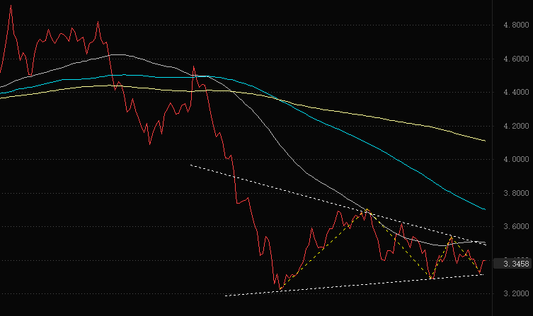 7月14日以来,COMEX铜期货价格持续中位震荡,上限不超3.73美元/磅,下限不破3.13美元/磅。内部结构呈现出收敛三角形的五浪调整特征,亦即:3-3-3-3-3。当然,第五个细分3浪尚未结束,待下周铜期货价格上触3.5美元/磅附近阻力,调整五浪完成,顺趋势的大跌行情或将启动。