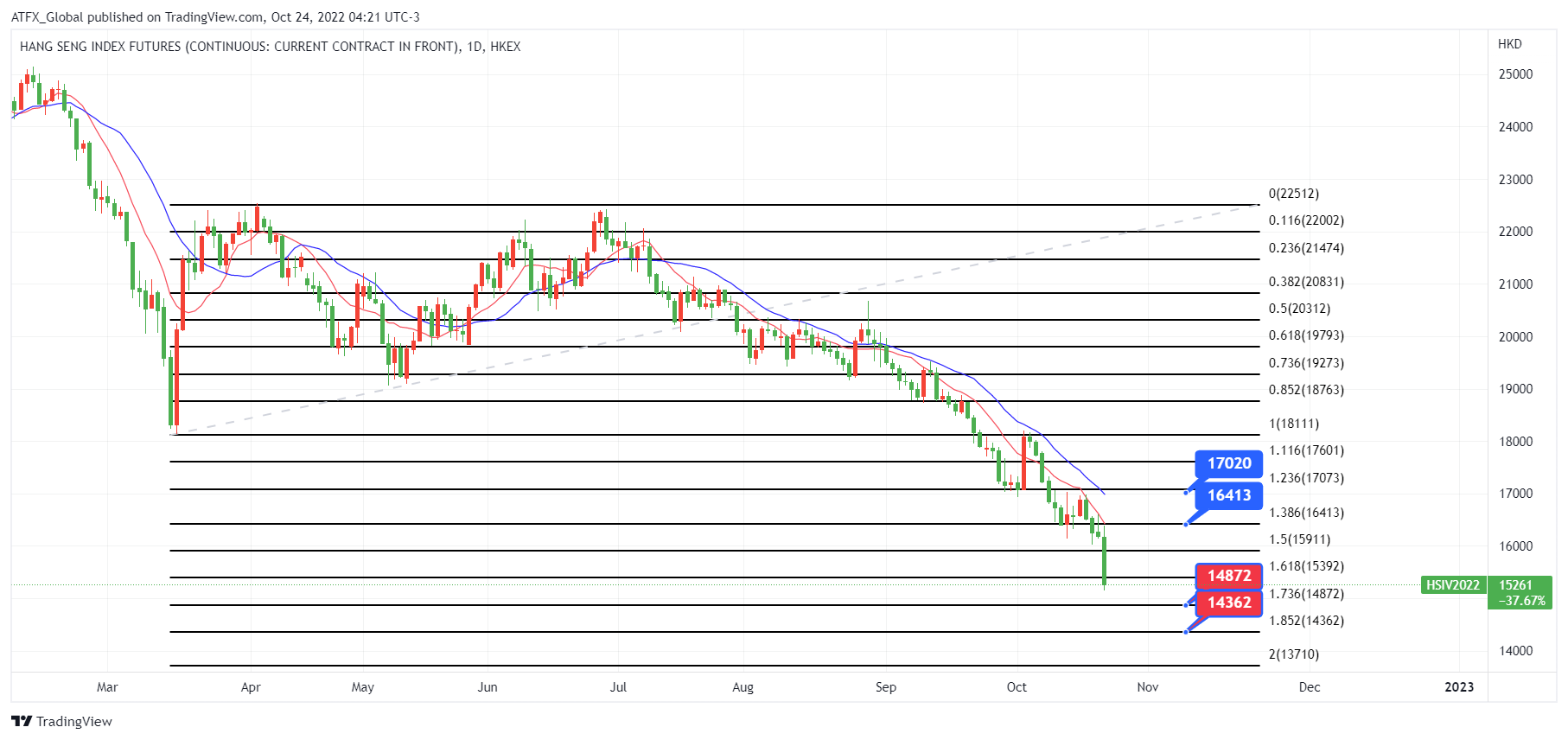ATFX恒指:香港股市周末首天交易日暴跌,午市开盘累计下挫千点, 跌幅逾6%, 此前中国最高管理机构的新成员阵容加剧了人们对国家主席习近平将以经济增长为代价加倍推行意识形态驱动政策的担忧。周日,习近平获得了打破先例的第三个领导任期,并介绍了由拥护者组成的新的政治局常委。这些任命表明中国从经济实用主义转向政治意识形态, 金融机构高盛分析师在客户报告中写道,中国高层缺乏公认的以市场为导向的经济改革者,这意味着中国离岸股票的风险溢价“可能在短期内保持高位”。 间接指出投资者对未来中国以及香港经济缺乏刺激经济亮点, 加上外国央行不断扩大加息力度, 美国11月首周亦毫无悬念计划加息75个基点, 股市存在内忧和外国加息压力下, 港股市值再度蒸发6%, 期间离岸人民币跌至每1美元兑7.2790 的四年低位。
