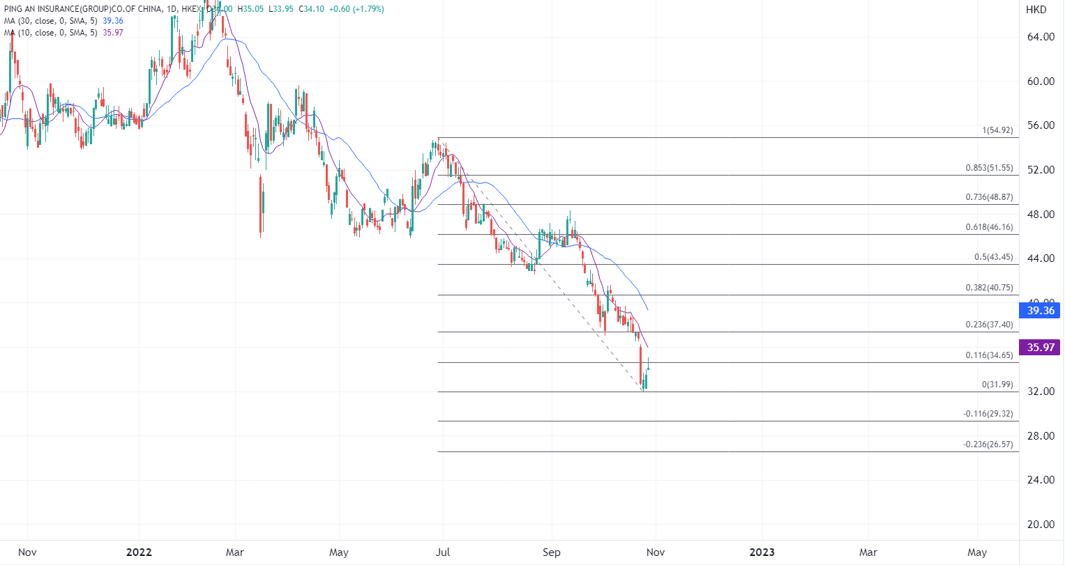 ATFX指出,中国平安今年以来累计跌近38%,跑输同类保险股,虽然平安前三季度整体纯利低于预期,不过作为主要业务指标的寿险新业务价值跌幅收窄,保费规模继续稳增长,是后续支撑股价修复的关键,不过仍将继续受到疫情和资本市场波动的影响。