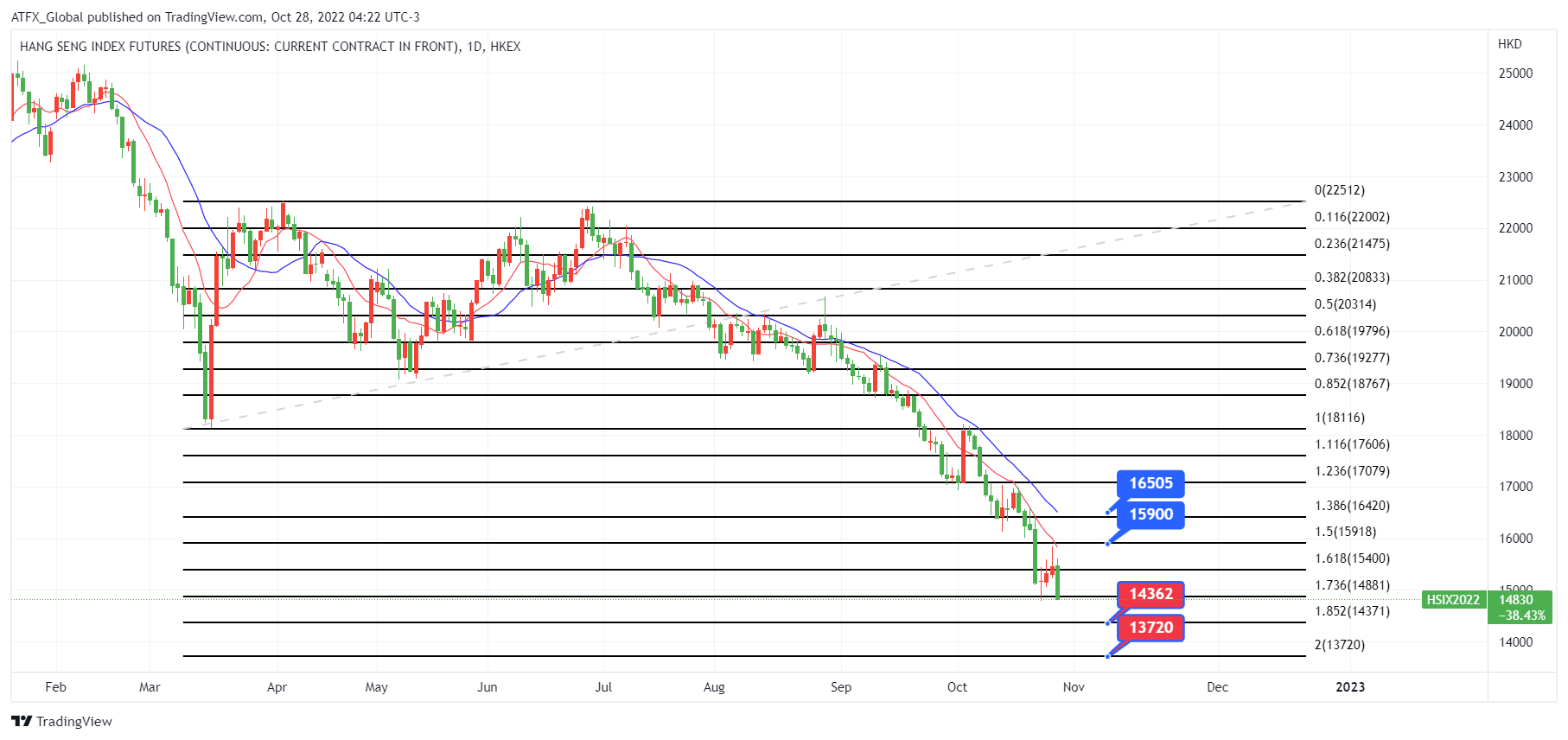ATFX恒指:因投资者应对美股好坏参半的收益报告,周五亚洲股市小幅走低,中国股市开盘下跌 0.60%,香港恒生指数下跌 0.5%后再度扩大跌幅, 国企指数及恒生指数分别挫4.4及4%, 其中受国内外经济不明朗因素增加, 新经济及相关科技股下跌, 恒生指数科技股指数领跌下, 拖累恒生指数跌幅扩大, 周五恒指收盘在14,800点徘徊再创15年低位, 过去近一个月累挫2450点。
