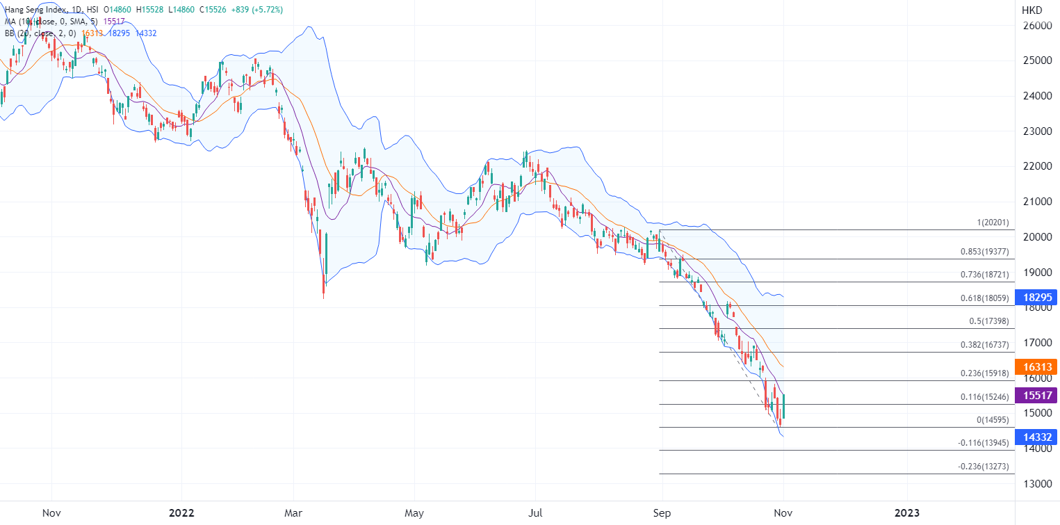 ATFX指出,港股在10月份,连续第四个月录得下跌,累计跌幅达到7000点,本月开局大涨体现资金在低位吸纳,也帮助恒指寻底,往年走势显示11月份港股多以盘整为主,波幅会相对减少,不过当前在外围市况下,预计短期波动仍不可免,判断当前已经寻得低位还为时尚早,技术上当前继续关注在布林带中下轨之间的交投。