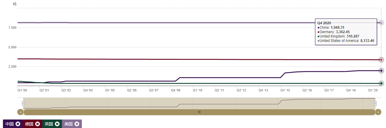 从上图中可以看出,黄金储备最多的是美国,高达8133.46吨;其次是德国,黄金储备总量为3362.45吨。中国的黄金储备为1948.31,处于中等水平。虽然在上图中看起来中国排在第三位,实际并不是这样,因为很多其他国家我们没有加入到图中。金融业非常发达的英国,黄金储备310.287吨,远低于其他发达国家。