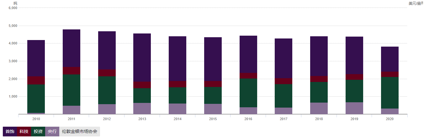 黄金投资是排在第二位的需求领域。根据2019年的数据,黄金投资总量为1264.9吨,相比2018年的1160.4吨,投资黄金的需求正在上升。根据2020年的数据,黄金的投资需求总量为1773.8,吨,再次超越2019年的需求总量。同时,2020年的投资黄金需求也高于同期的黄金饰品需求,后者总量为1400.8吨。