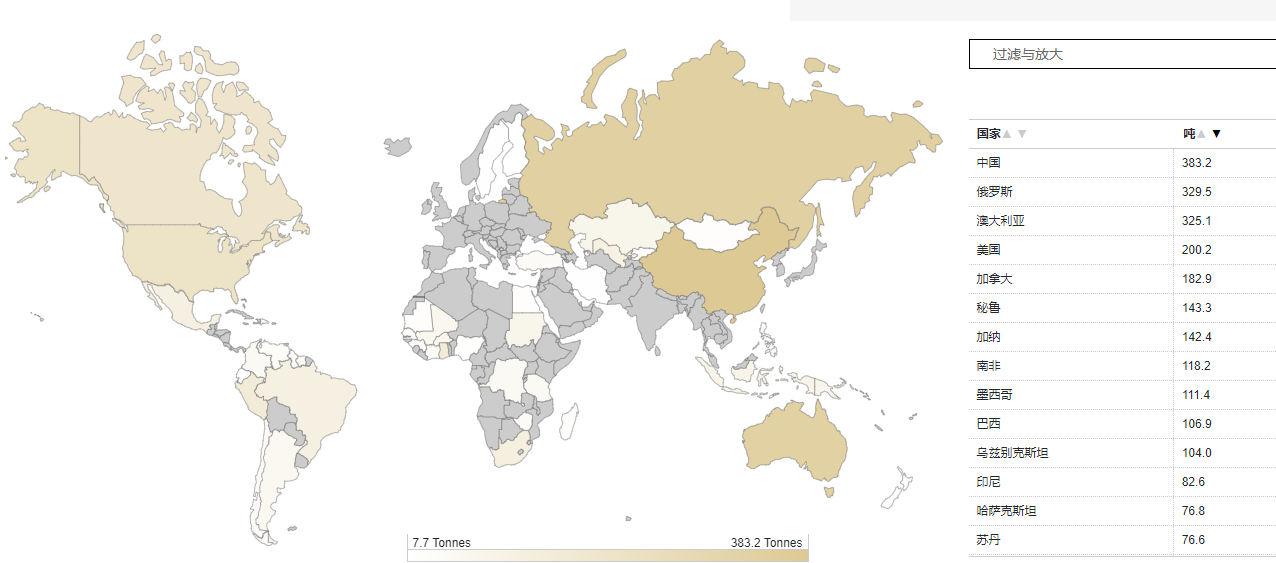 黄金供应的源头是金矿开采。早些年的时候,南非是黄金开采大国,最辉煌的成绩是一年开采出了1000多吨黄金,创出人类历史之最。但是,自然资源开采的特征是:前期开采成本低、开采难度小,但越往后,开采难度和成本都会急剧升高。黄金的开采也是这样,在表层的金矿开采完毕之后,采矿商被迫选择开采难度更大的深层矿。南非的金矿产量也随之下滑,其它国家的金矿产量排名不断提高。根据2019年的数据,中国成为全球金矿产量最大的国家,如下图:
