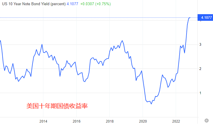 美债收益率同样对CPI数据反应敏感。8月份十年期美债收益率3.1320%,10月31日收盘价4.077%,三个月时间上涨0.945%,表明市场仍认为美国政策利率将不断上行。今日最新值4.1077%,已经创