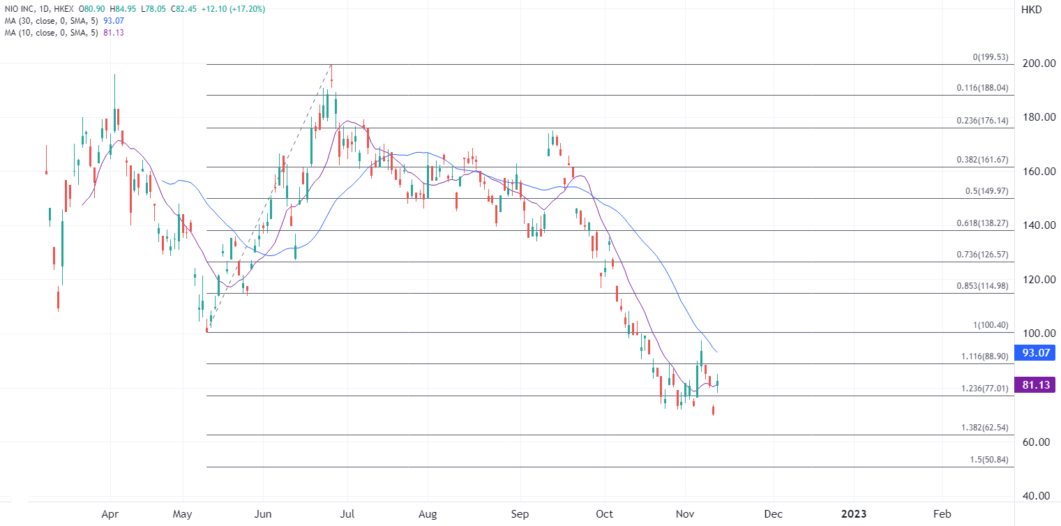 ATFX指出,虽然第三季亏损高于市场预期,但蔚来管理层对于明年四季度实现盈亏平衡的展望和今年四季度交付指引为市场提供了积极的信号。经过日内的反弹,蔚来股价自前一日的低点反弹近20%,如果日内收盘维持在10日均线上方,将锁定下一个目标在88.90,但需要有效突破近三周的区间,重上100港元才能确定反弹趋势。