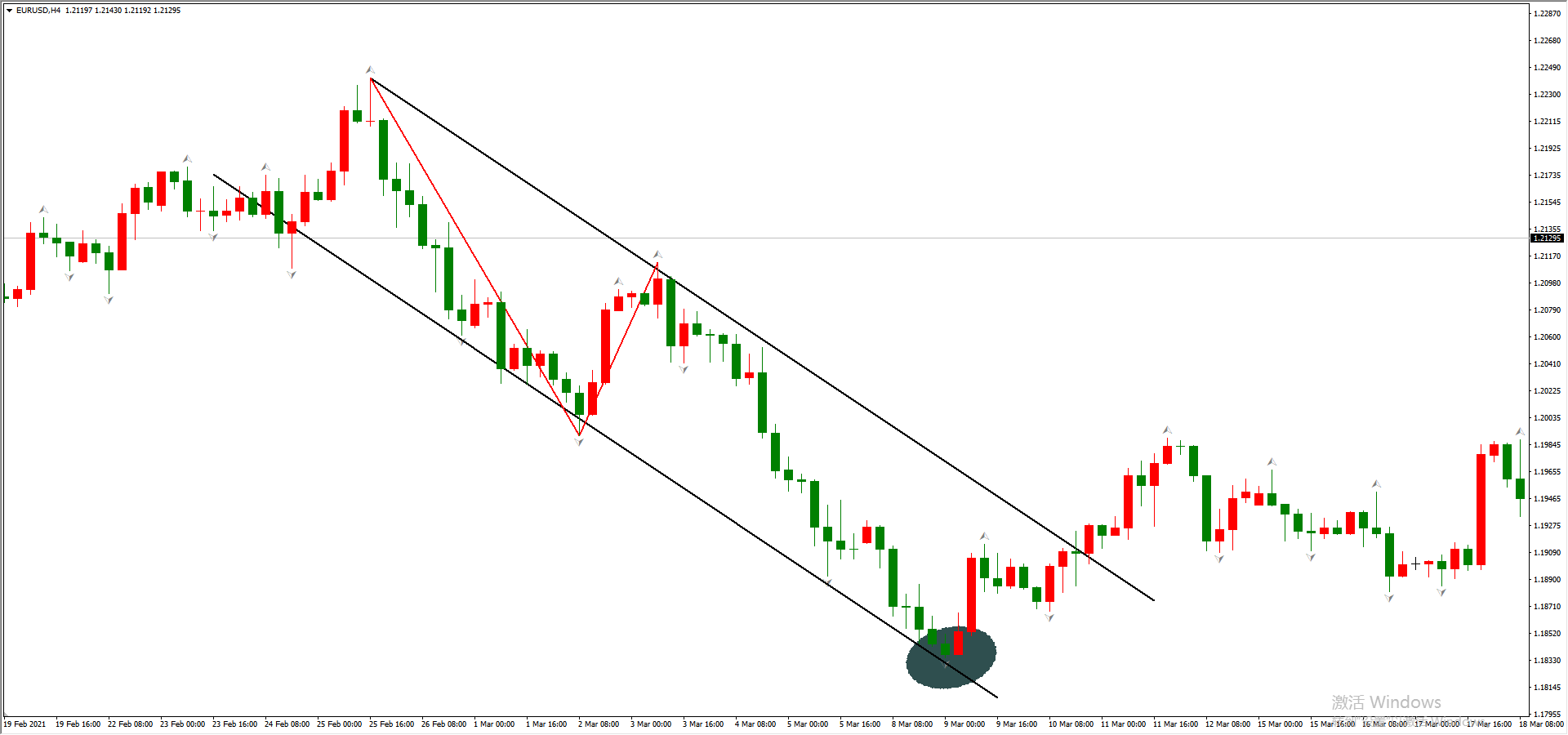 速率线还可以进行平移,移动的基准点是中间点B,这样可以获得通道线。比如: