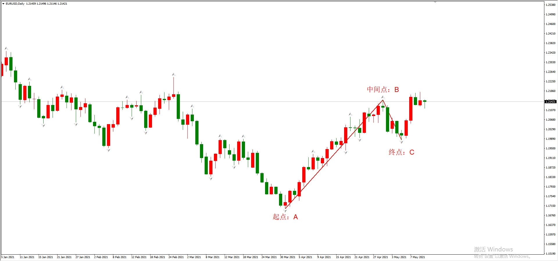 对于勾形理论来说,速率线不是用在单一波段之上,而是勾形结构之上。勾形结构实际上是两个方向相反的波段的连接,这样会天然出现三个关键点:起点A、中间点B、终点C。如下图: