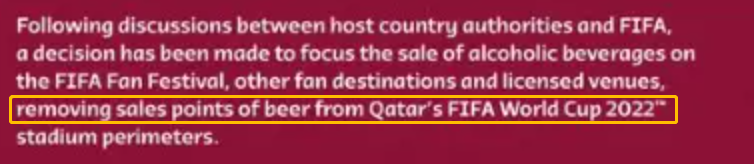 次要因素是国际足联的“禁酒令”,要求世界杯期间全部8座球场以及周边区域将禁售酒精饮料。作为赛事赞助商的百威啤酒第一时间在社交媒体表示:“很尴尬”。虽然百威旗下的啤酒品牌Bud Zero不在禁售之列,但该款产品为无糖无酒精的饮品,并不能算是传统意义上的啤酒。卡塔尔是伊斯兰教国家,吃猪肉和喝酒精饮品都不被允许,所以国际足联提出禁酒的要求无可厚非。之所以市场对该禁令有如此大的反应,主要是因为国际足联通知的时间在18日,距离世界杯开幕式仅三天时间,令百威啤酒和一众球迷措手不及。