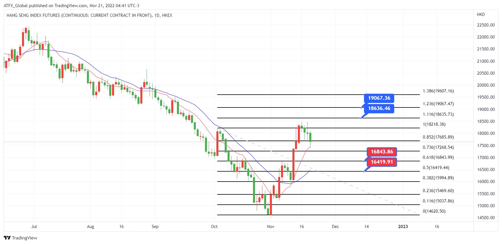 恒生指数期货四连涨后, 根据裴波反弹线计算, 恒生指数期货该升浪的技术调整或至17269与10日均线一起靠近. 若恒生指数期货失守该重要位置将会下探16844或下试16420。若恒生指数期货仍然巩固在10日均线上方的形势, 走势可望上探以裴波反弹线计算的上方阻力18636或19067。