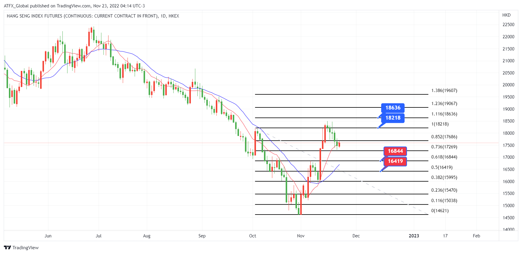ATFX恒指:尽管中国的新冠病例不断增加不利股市, 但亚洲股市周三大多处于近期低迷走势中的上涨区域,投资者在观望周四早上的美联储11月政策会议纪要。香港恒生指数早盘上涨 0.6%,而中国沪深300指数开盘基本持平, 午后两地指数扩大升幅, 相信因隔晚美股三大指数反弹逾1%有关。道琼斯工业平均指数周二上涨1.2%至34,098.1,标准普尔500指数上涨1.4%至4,003.58,纳斯达克综合指数上涨1.4%至11,174.41。
