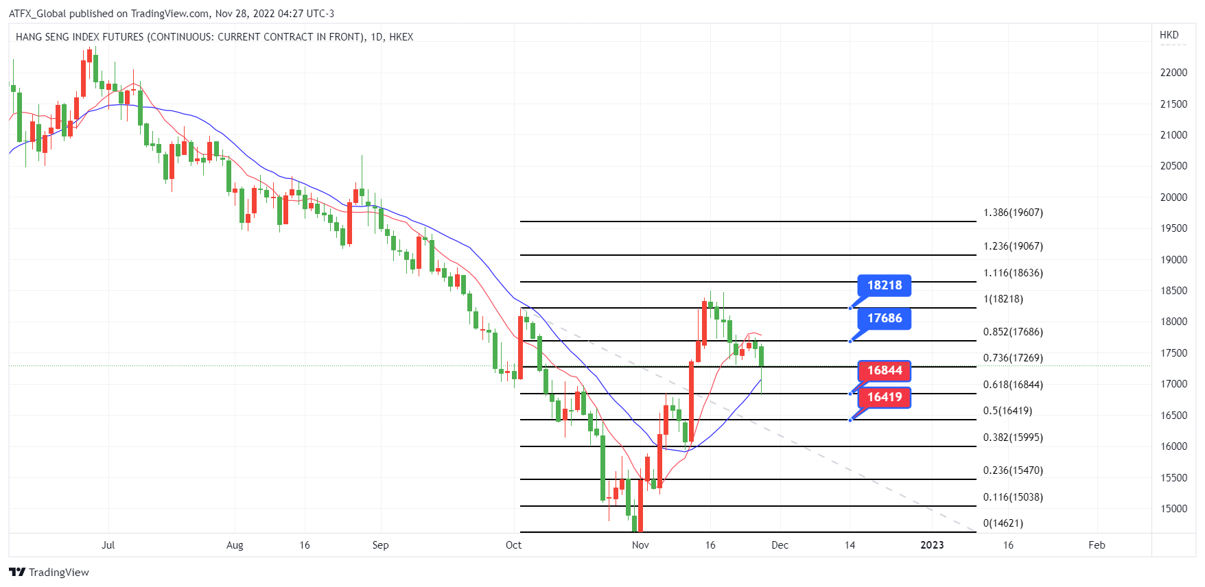ATFX恒指:周一大多数亚洲股市下跌因随着中国新冠疫情卷土重来, 新增病例反弹并创下历史新高,更多城市采取严格的防病毒措施。中国股市下挫,蓝筹股沪深沪深300指数下跌1.7%,上证综合指数下跌1.2%。 香港股市是亚洲表现最差的股票,恒生指数下跌 2.1%。