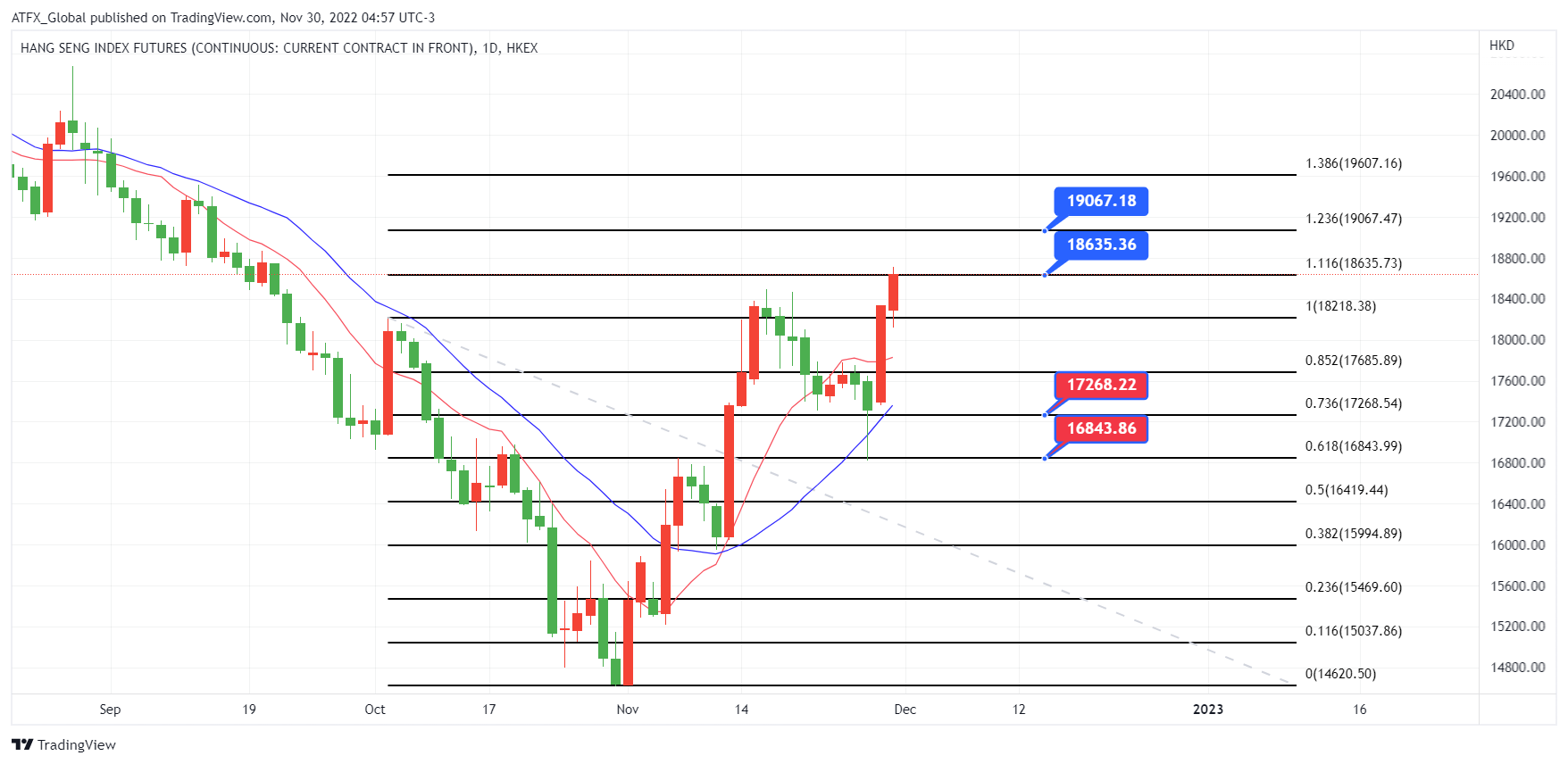 ATFX恒指:周三大多数亚洲股市开盘下跌, 周三中国的数据显示,中国11月的经济活动低于预期,因为与防疫封锁造成的破坏继续削弱增长,并恶化了制造商的情绪。中国政府数据显示,11月份官方制造业采购经理人指数降至48.0,低于预期的49.0,远低于上月的49.2。制造业以外的行业收缩更为显着,11月份非制造业 即服务业读数为46.7,低于预期的48,低于上月的48.7。这导致该国整体商业活动进一步收缩,11月份综合采购经理人指数读数为47.1,低于上月的49.0。采购经理人指数读数低于50表明该行业正在收缩。