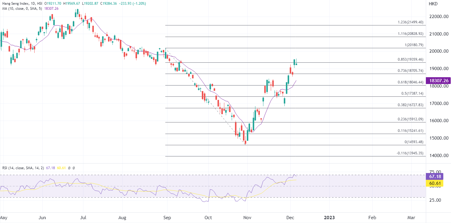 ATFX指,港股昨日创下9月份以来最高位后动能放缓,连续两日测试19500上方但未突破,消息面上随着市场消化防疫放宽利好后,支持继续大涨的氛围减弱,配合技术面压力,恒指重点看19500至20000整数关口之间的阻力,短线提防回调,不排除回到18000附近再度盘整。