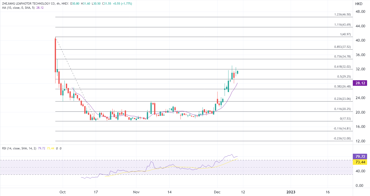 不过ATFX指出,对比起头部新势力,零跑汽车当前的营收和盈利规模仍有相当大的差距,研发方面投入增加但在业内看来实属偏低,偏低端的车型缺乏竞争力,如何在销量上保持追赶还需要策略的转变。且在估值经历回调的汽车板块,零跑汽车当前估值并不具备吸引力。股价经过连续上涨,短线已经超买,留意32港元上方阻力。