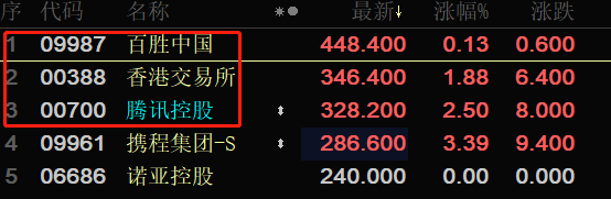 港股市场股价排名前三的个股分别为:百胜中国、香港交易所、腾讯控股。这三家上市公司的股价走势对恒生指数的未来波动具有较强的指向性。香港交易所比较特殊,其营收变动与所有港股的交易量相关。牛市来临时,香港交易所股价必定走强;熊市来临时,港股交易量急剧下降,香港交易所的股价也随之走低。所以,香港交易所的股价是港股市场涨跌后的“结果”,前瞻性不足,故对其一般关注即可。