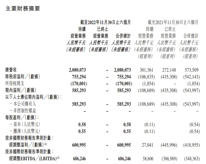 集团截至去年11月底止中期业绩转亏为盈,录得股东应占溢利5.85亿元人民币,每股盈利58分,2021年同期股东应占亏损5.44亿元人民币。期内总营收20.8亿元人民币,按年升2.63倍。