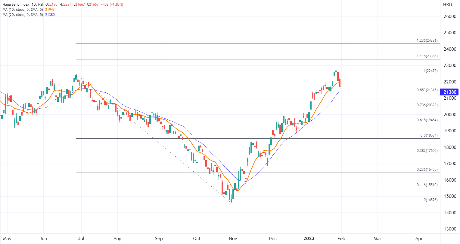 技术上恒指短暂测试前高范围后回吐,因此也带来了顶部压力,当前下破10日均线所在的22000关口,留意短线仍有下压,目前看20均线及斐波位所在的21300水平作为初步支撑,如果守住并随本周晚些时候的情绪回稳,将再次指向高位阻力。但如果失守上述均线,则可能进一步考验20000点关口。
