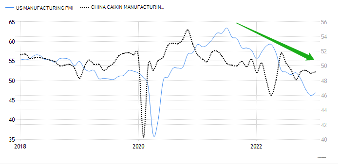 在印度尼西亚铜矿厂停产之前,铜期货和江西铜业股份已经处于中期上涨趋势之中。2022年7月15日至今,铜期货累计上涨26.01%,最高触及9550.5美元/吨;江西铜业股份累计上涨54.55%,最高触及14港元/股。本轮长是主要源于供需不平衡。铜主要应用于电气、机械制造、建筑工业、交通运输等领域。总的来说,制造业对铜的需求量最大,而衡量制造业所处经济周期的指标为制造业PMI。中国和美国是全球最大的两个经济体,两者制造业PMI数据的走向,代表了全球制造业的发展趋势。