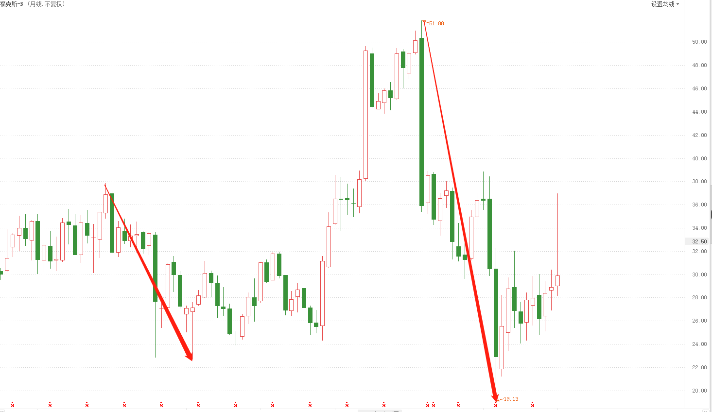 ATFX科普:与其说美股指数十多年长牛行情,是美股机构化的胜利,倒不如说是大权重成分股的胜利。想象一种情况,某股票指数的前十大成分股权重总和,超过所有股票权重的50%,那么该股票指数的上涨或者下跌,将完全取决于前十大权重股的表现。想要营造该股票指数十年长牛的假象,只需要机构投资者抱团买入高权重股票即可。换句话说,这种权重分布极不合理的模式,会导致指数的走势不能代表大部分上市公司的基本面情况。举个例子:下图为美股福克斯(FOX)的股价走势图,它占据美股指数的比重不足0.01%,它的上涨或者下跌不会对股票指数不会造成任何影响。