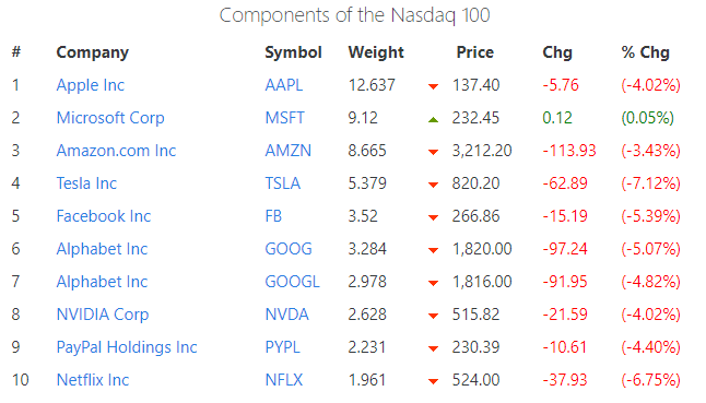 ▲上图为纳斯达克100指数前十大权重股-ATFX