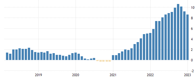 2021年开始,欧元区的CPI增速剧烈升高,直到2022年10月份才开始触顶回落,峰值为10.6%。今年一月份,欧元区CPI增速8.6%,虽然低于峰值水平,但仍处于相对高位,欧央行仍有充足的理由执行激进加息政策。
