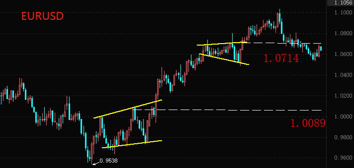 受到上述因素影响,欧元相对美元仍有持续的升值动力。技术角度看(如下图),EURUSD短期回调阻力位在1.0714,市场价格已经击穿该阻力位。但是,1.0714所代表的调整区间下限尚未被触及。多头趋势的中枢结构虽然有走坏迹象,但只要下限不被突破就仍有希望。远期阻力位在1.0089位置,预计本轮回调较难触及。