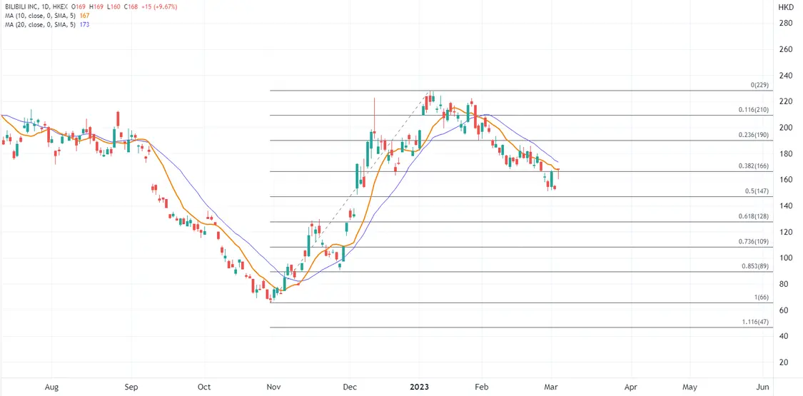 ATFX指,哔哩哔哩股价今年以来累计下跌近10%,跑输同行业平均累计近15%的涨幅。不过按照其成本控制策略以及最新业绩改善,表明其未来几个季度有望实现盈利。日内股价高开但未能维持高走,当前受制于日图10均线阻力,如果再次回吐将寻求147港元的支撑,若跌破147则意味着更大下行空间打开。