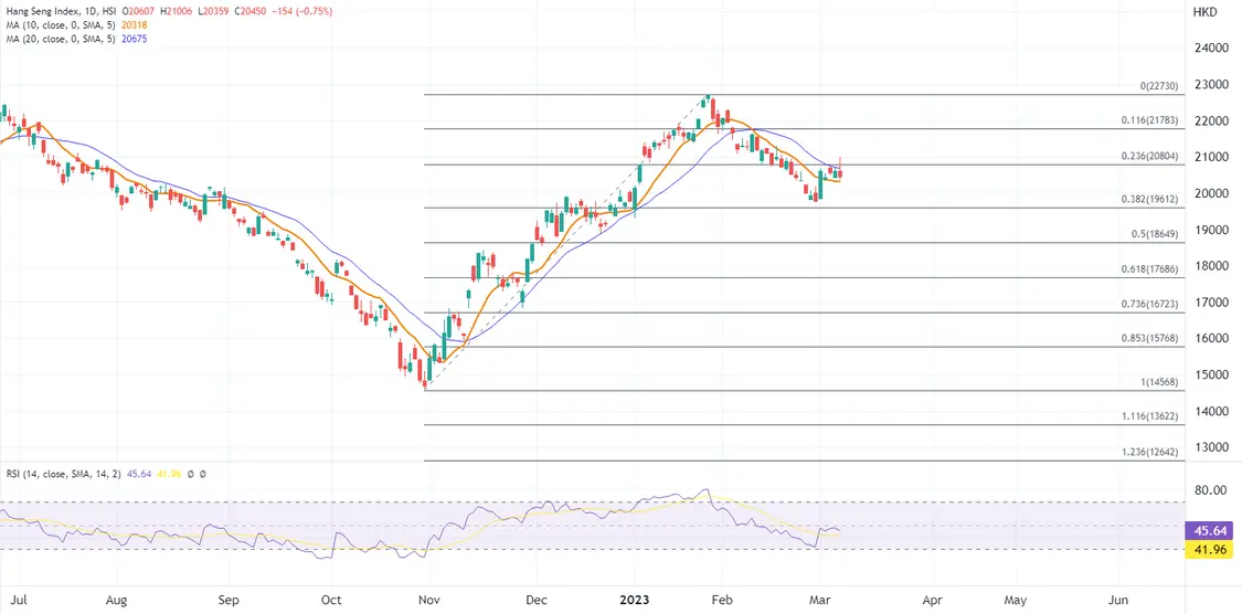 ATFX分析,港股日内尝试反弹,但走势等待消息面的指引而动力稍显不足,包括两会的召开和外围今晚市场聚焦在美联储主席半年度货币政策听证。恒指当前技术上也受制于日图20均线,如果能得到消息面的利好配合可展望突破,再次看向21783至22000关口,但在此之前,可能会继续在均线之间盘整。