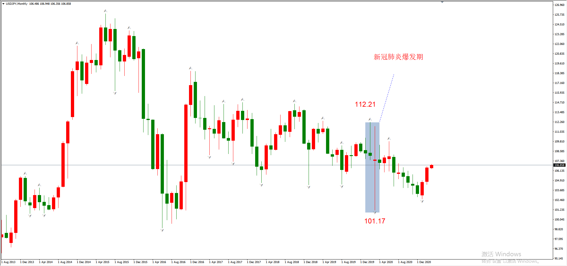 从USDJPY月线图来看,1月开盘价108.07,4月收盘价107.13,跌幅0.961%,连1%都没有达到,很难称之为避险货币。这段时间的最高价出现在2月份,为112.21,最低价出现在3月份,为101.17,最大振幅为9.838%,将近10%,还算不错。如果计算USDJPY在2020年全年的走势,12月份收盘价为103.24,跌幅4.46%,也不算很大幅度的升值。从该案例来看,日元避险属性不明显。