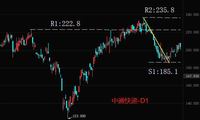 技术角度看,早在2022年10月31日,中通快递的日线股价就已经形成中期多头趋势,今年2月2日~3月2日的回调波段并未破坏多头趋势结构。短期反弹的支撑位如上图所示的S1:185.1,短期阻力位是R1:222.8。由于近期恒生指数的短线走势偏疲软,所以中通快递的反弹有可能不会一次性突破R1,预计将会在R1~S1之间震荡一段儿时间。年内高点R2:235.8是重要的点位,一旦市场价格有效突破该点位,则中期多头趋势重新启动。