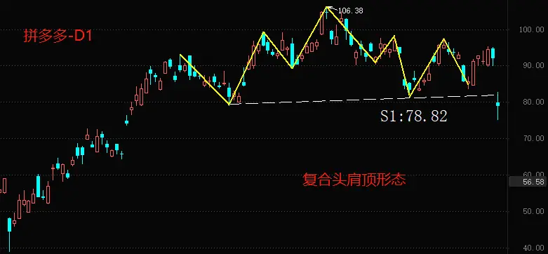 技术角度看,去年12月13日至今,拼多多呈现出复合头肩顶形态,颈线位如图中S1:78.82所示。今日的跳空下跌,正好突破了颈线位,表明多头力量已经被空头完全压制,后市大概率出现流畅的下跌走势。月线级别来看,2021年2月份拼多多创出历史最高股价,之后开启漫漫熊途。2022年3月至今年一月末的大反弹,尚无法形成转势结构。由于拼多多股价已经失去了业绩高成长性的支撑,我们认为拼多多股价最好的情况是保持地位震荡,比较坏的情况是继续创出新低。