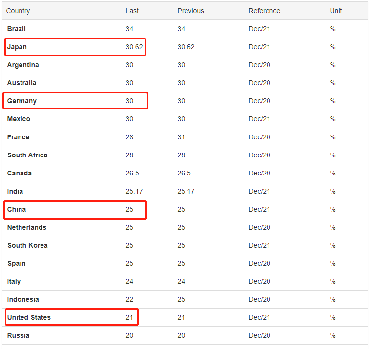 各国税率都保持相对稳定,一般情况不进行调整。上图是当前各国最新的企业所得税税率,可以直观感受目前的税率水平。美国企业所得税21%(特朗普2017年减税之前为35%),中国25%,德国30%,日本30.62%,英国19%(不在图中)。几个主要发达国家的税率当中,德国和日本最高,中国在中游,美国最低。