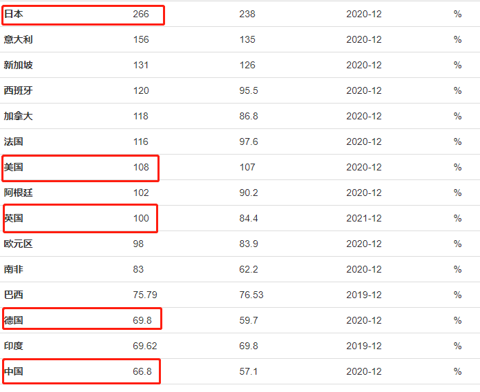 债务的严重程度通常以其和GDP总值的比值来衡量。主流发达国家当中,日本债务率最高,达到266%,意味着日本想要还清政府债务,必须牺牲两年半的GDP总值。其次是美国,债务率高达108%;中国和德国的债务率均低于70%,按照国际通行标准80%衡量,两国债务率均极为健康。英国债务率100%,处于中等水平。