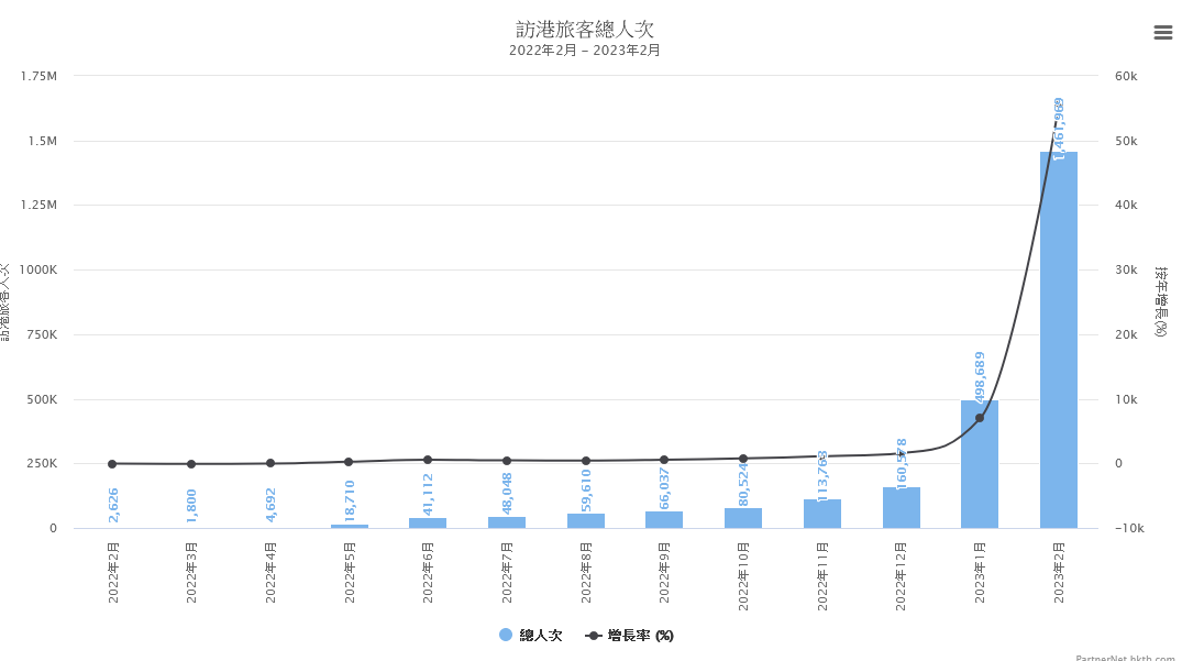 尤其值得关注的是,自两地通关以来,内地访港旅客接连出现高峰,占到整体访港客的七成,3月中下旬旅客人数已回复至疫前的4成半。2月份访港旅客出现单月破百万,为三年来首次,已经恢复至疫情前同期的近三成。
