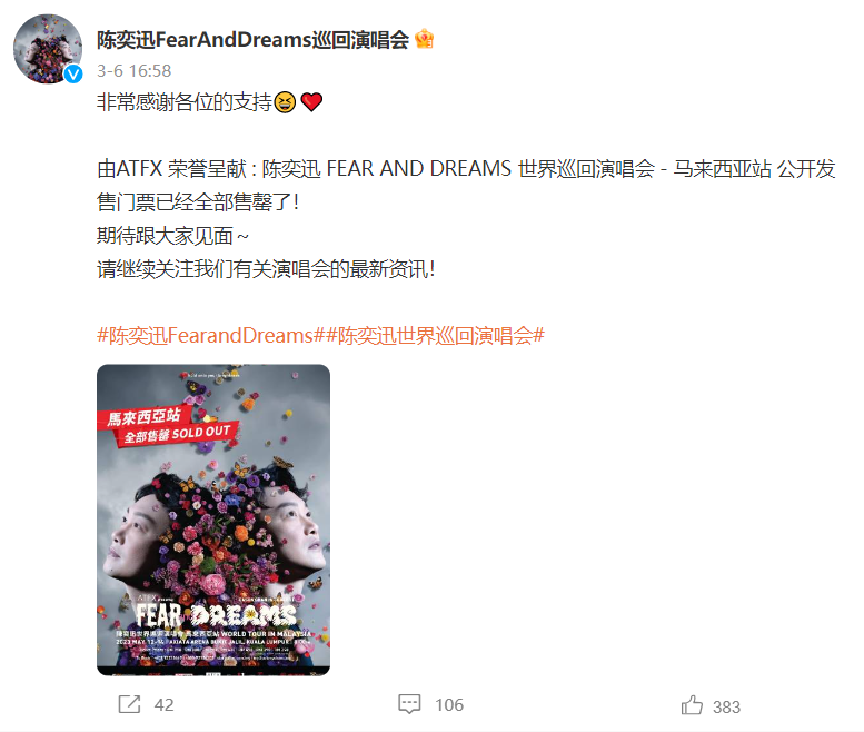 ATFX作为此次演唱会重要赞助商,将在这几场全球关注度颇高的音乐盛典,与歌迷们共同见证陈奕迅在舞台上的“恐惧与梦想”。据悉,《FEAR AND DREAMS》世界巡回演唱会马来西亚站门票已于2023年3月6日开售,在短短的几个小时内,万人公开发售门票已经全部售罄了,足以见得歌迷对陈奕迅世界巡回演唱会的期待。