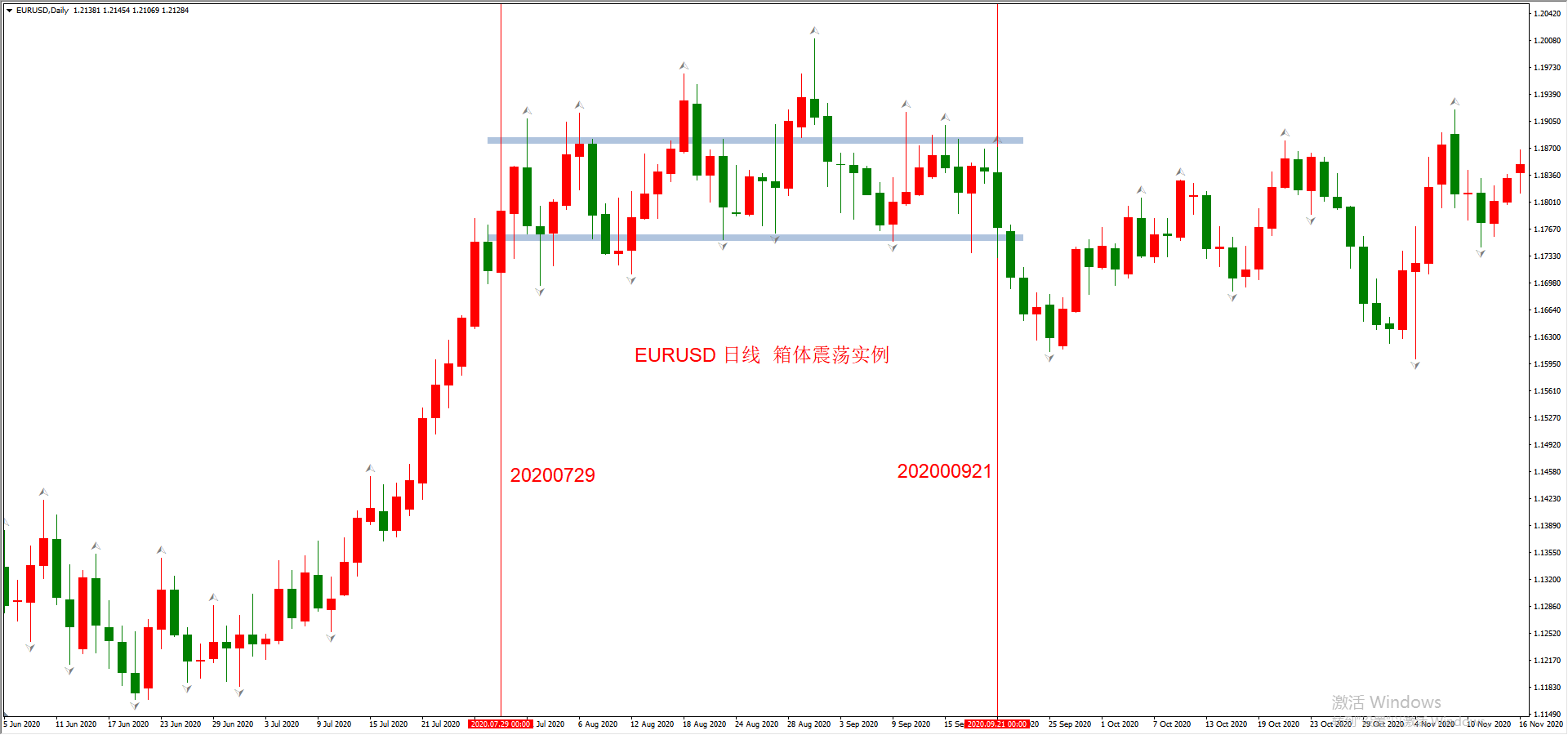 震荡行情的核心特征是:最新高点与前一个高点的差距较小;最新低点和前一个低点的差距也较小。典型的就是箱体震荡,比如下图中的例子: