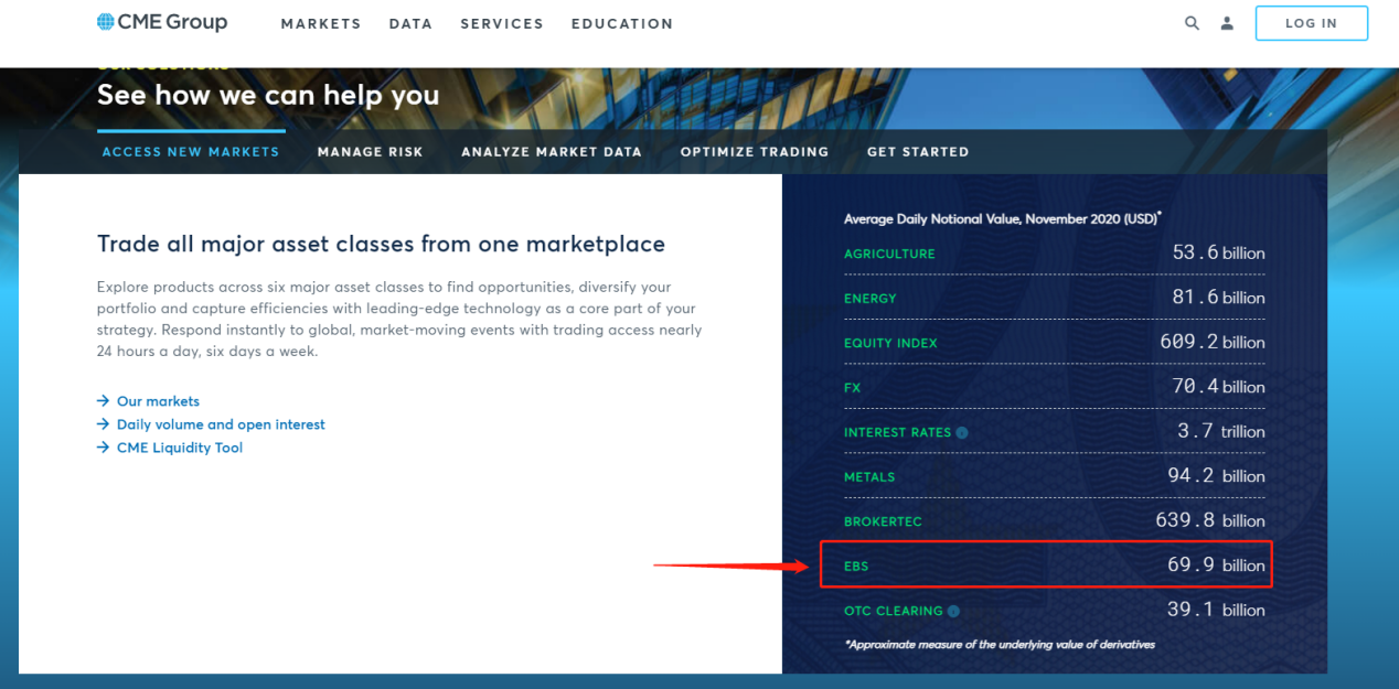 EBS英文全称Electronic Broking Services,中文直译为电子经纪服务,该平台由多家全球最大的银行作为合伙企业创建,成立日期在1990年,最初的目的是为了完善银行间外汇电子类大宗交易。在过去的三十年,EBS几经易手,先是与BrokerTec合并,成立了EBS BrokerTec,之后更名为NEX Markets,最后在2018年被芝加哥商品交易所收购,成为其宣传自己外汇交易实力雄厚的一杆大旗。EBS在交易高峰时期,每分钟有高达500至1100次的交易指令,所以可以为银行提供非凡的流动性。