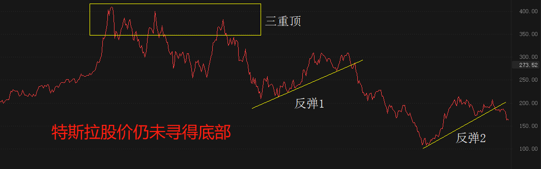 纯技术角度看,特斯拉空头趋势仍将延续,可靠的底部支撑仍未出现。2021年11月至2022年4月,特斯拉的日线股价形成三重顶,前期的多头趋势彻底终结。2022年5月份至今,日线股价经历两次显著反弹,但都没能改变空头趋势结构。本月初,特斯拉股价跌破第二次反弹的趋势线,意味着新一轮顺势下跌开启。当前市价162.55美元,中期下跌目标位在120美元,也就是反弹2的起涨点。