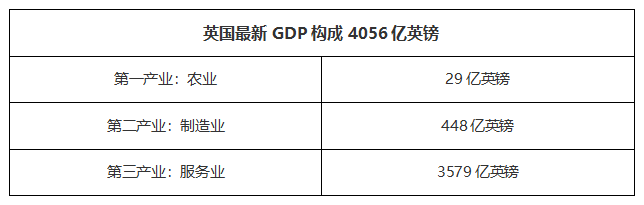 英国的制造业产值占据GDP总值的比重仅为11%,而服务业的占比高达88.23%,第三产业占据绝对主导地位。第一产业占比最低,这是三次工业革命后的正常现象,因为农副产品的价格相比工业品和服务产品完全不具备价格优势。不过,英国的产业空心化并不是发生在最近几年,而是发生在19世纪末20世纪初。英国的工业产出在1830年依旧处于高位,且不断扩张,当时的比重为9.5%,1870年之后上升为22.9% ;但是,到了1913年工业产出下降到13.6%,到1938年更是下降到10.7%,再到1973年下降到4.9%。进入撒切尔夫人执政的年代(1979~1990),去工业化更是愈演愈烈。可以说,英国的去工业化到2021年仍在持续,只不过不再像以前那么激烈和明确。