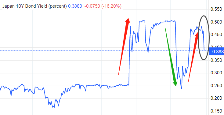 日本的十年期国债收益率呈现出强震荡特征。2022年12月19日,国债收益率0.256%,今年一月和二月基本维持在0.5%上限附近,三月份再次回到0.237%低位,4月25日涨至0.484%,今日最新报价0.388%。五个月时间里,十年期国债收益率震荡性涨跌了三个来回。债市利率是央行利率的先行指标。随着最新一轮债券利率下降,市场主体资金已经不再预期日本央行在短期内上调利率或者扩大债券收益率调控范围。由于3年期国债收益率为-0.03%,所以三年内日本央行改变YCC的可能性不大。