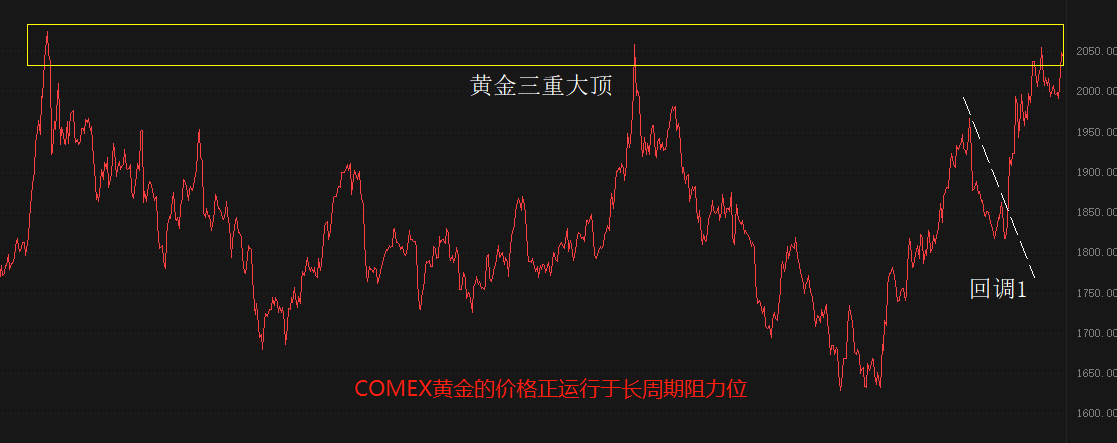 纯技术角度看,COMEX黄金的价格正运行于长周期阻力位。2020年8月、2022年3月,还有今年5月,黄金的最高价分别为:2081美元、2078美元、2050美元。三个高点基本上处在同一区间内,今年5月份的涨势能否一举突破2080美元的长期阻力位,仍存疑。如果有效涨破2080的话,黄金长周期的大涨将成为现实。如果持续运行于2080美元以下,黄金价格有可能重演2020年和2022年的大跌之势。面对黄金长周期涨跌的临界点,交易者需要保持足够的谨慎。