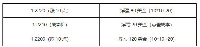 假设,总资金10000美金,杠杆200倍,买入EURUSD的汇率为1.2210,点差2.0,单量为1手,不设止损。EURUSD的点值为10美金,也就是每波动一个标准点,盈亏10美金。由于点差成本存在,在买入的那一刻,账户“获利”部分显示为:-20美金。按照浮动保证金的算法,1手EURUSD的保证金为500欧元,也就是610.5美元。此时,“已用预付款”部分显示为:610.5美元(固定保证金以平台公布为准)。此时,除去点差成本和保证金,账户上的可用预付款为:10000-20-610.5=9639.5美元。下表是各种情况下的浮亏金额:
