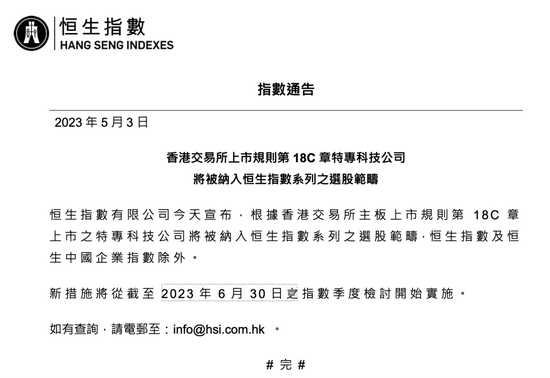 5月3日,香港恒生指数有限公司宣布,根据香港交易所主板上市规则第18C章上市之特专科技公司将被纳入恒生指数系列之选股范畴,但不包括恒生指数及恒生中国企业指数,新措施将从截至6月30日之指数季度检讨开始实施。