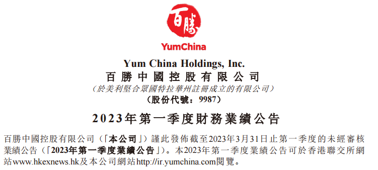 ATFX港股:百胜中国在中国市场拥有肯德基、必胜客和塔可贝尔三个品牌的独家运营和授权经营权,并完全拥有小肥羊、黄记煌连锁餐厅品牌。截至今日,百胜中国总市值为2036亿元人民币,港股餐饮板块首位,排名第二的海底捞总市值仅为百胜中国的一半左右。5月3日发布的第一季度财报显示:营收总额200.4亿人民币,同比增长9.33%,不计算汇率影响的话,增速为18%,表现超预期良好。归属母公司净利润19.86亿,同比大增189%,接近翻两倍。百胜中国在2023年业绩开门红,表明疫情结束之后餐饮业正在快速复苏。正如百胜中国首席财务官杨家威先生所说:「第一季度的销售同比和环比皆显著回升。这得益于我们抓住疫情防控放宽带来的机遇,努力提振销售的结果。」