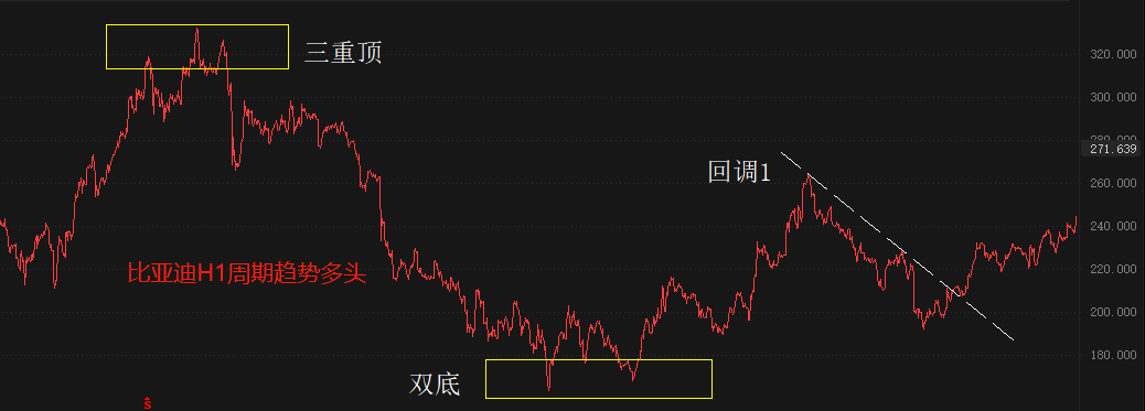 纯技术角度看,比亚迪H1级别趋势为多头。2022年11月上旬形成双底结构,今年2月至三月初形成回调,3月中下旬触底反弹重新进入涨势。本轮短周期上涨目标位可暂定为反弹1的高点268港元,现价244.2港元,仍存在10%左右的上涨空间。港股市场汽车板块近两周处于强烈的升势之中,预计将会对比亚迪股份的上涨形成提振。