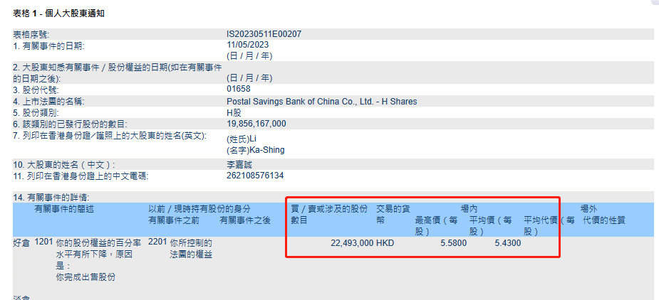 邮储银行(01658)遭李嘉诚减持,联交所披露,李嘉诚周四(11日)减持2249.3万股邮储银行H股,平均价每股5.43元,套现1.22亿元,李嘉诚及儿子李泽巨的邮储银行H股权益降至9.97%或19.80亿股。
