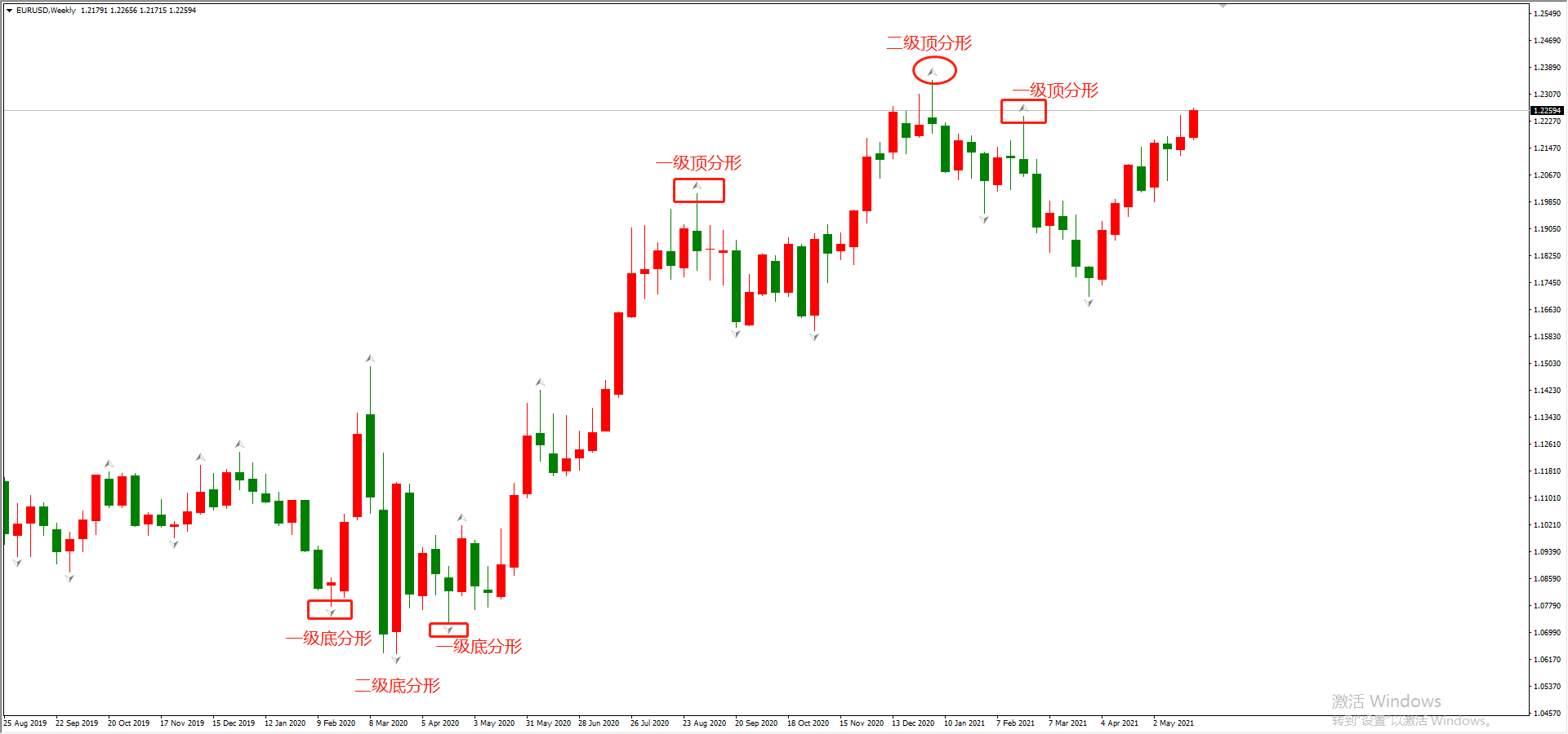 分形点所在的位置,往往是重要的阻力位和支撑位,一旦被突破,则可以顺理成章的入场交易。不过,在分形点当中也存在分级。大部分分形点都属于一级分形点,少部分分形点为二级分形点。